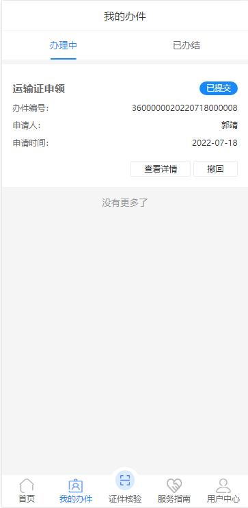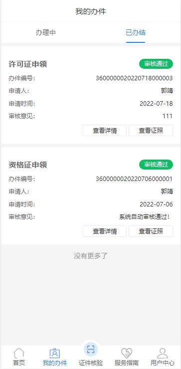 證照申領之后可以在“我的辦件”中查看辦件進度,“辦理中”顯示的是未辦結的申領信息,在此處可以“查看詳情”、“撤回”操作。“已辦結”顯示的是已經辦理完結的申領信息,包含“審核通過”、“審核不通過”的申領信息,“審核通過”的情況下可以直接點擊“查看證照”查看證照的詳細信息。