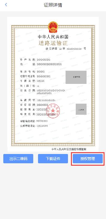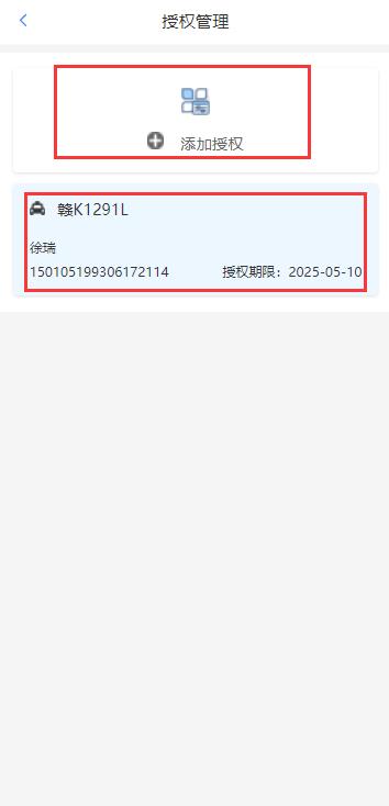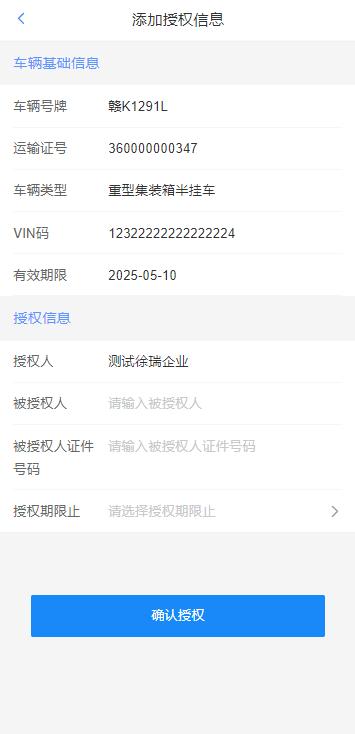 車輛所有人進入運輸證詳情頁面點擊“授權管理”,可針對駕駛員進行“添加授權”或者點擊已有權限進入授權詳情頁面。