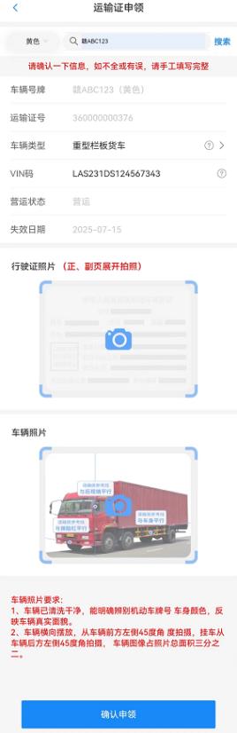 道路運輸從業企業及個體戶在交通運輸主管部門辦理配發道路運輸證業務且已經申領許可證(網絡預約出租汽車運輸證無需申領許可證)后進入本系統首頁點擊“運輸證申請”,進入到業務申請頁面,對信息進行確認完善,并通過系統拍照或者上傳“機動車行駛證(正、副頁展開拍照)和車輛照片”,確認無誤后點擊“確認申領”按鈕提交至主管部門等待審核。