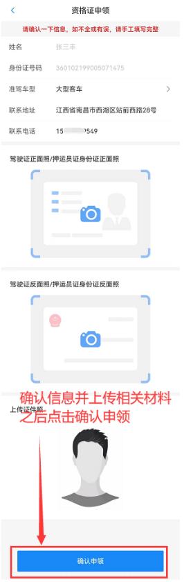 道路運輸從業人員在交通運輸主管部門辦理完相關發證業務之后進入本系統首頁點擊“資格證申請”,進入到業務申請頁面,對信息進行確認完善,并通過系統拍照或者上傳“駕駛證正頁、副頁(當僅為押運員證時上傳身份證正反面)、1寸照片”,確認無誤后點擊“確認申領”按鈕提交至主管部門等待審核。