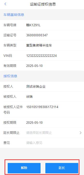 車輛所有人在“添加授權信息”頁面輸入“被授權人姓名、身份證號以及授權期限止”信息后點擊“確認授權”之后,駕駛員可以在系統中查看并對該車輛亮證。當駕駛員授權到期或者離職之后需要解除授權時,點擊授權詳情進入授權信息維護頁面,可進行延期或者解除操作。