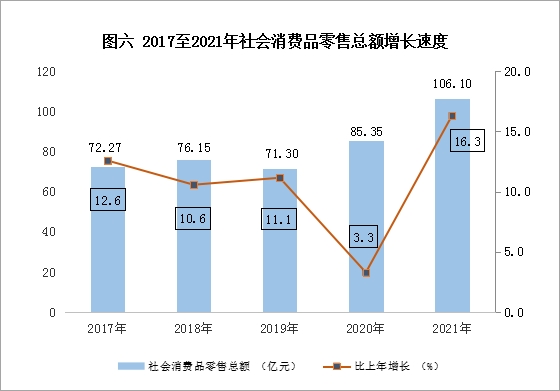 在限額以上單位商品零售額中,均實現正增長,按產品銷售地看,城鎮18.18億元,增長15.9%,鄉村0.33億元,增長10.1%。按消費形態分,餐飲收入2.77億元,增長59.3%,商品零售15.74億元,增長10.5%。