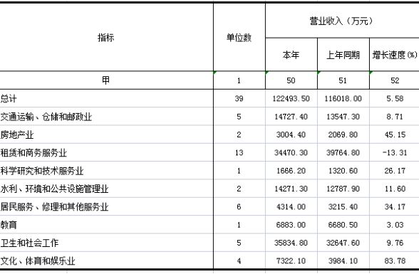 全縣規模以上服務業營業收入12.25億元,增長5.58%;營業利潤1.05億元,下降32.84%。分行業看,九個行業中八個行業營業收入正增長,其中實現兩位數增長的有5個行業,分別為:文化、體育和娛樂業增長83.78%,房地產業增長45.15%,居民服務、修理和其他服務業增長34.17%,科學研究和技術服務業增長26.17%,水利、環境和公共設施管理增長11.6%。