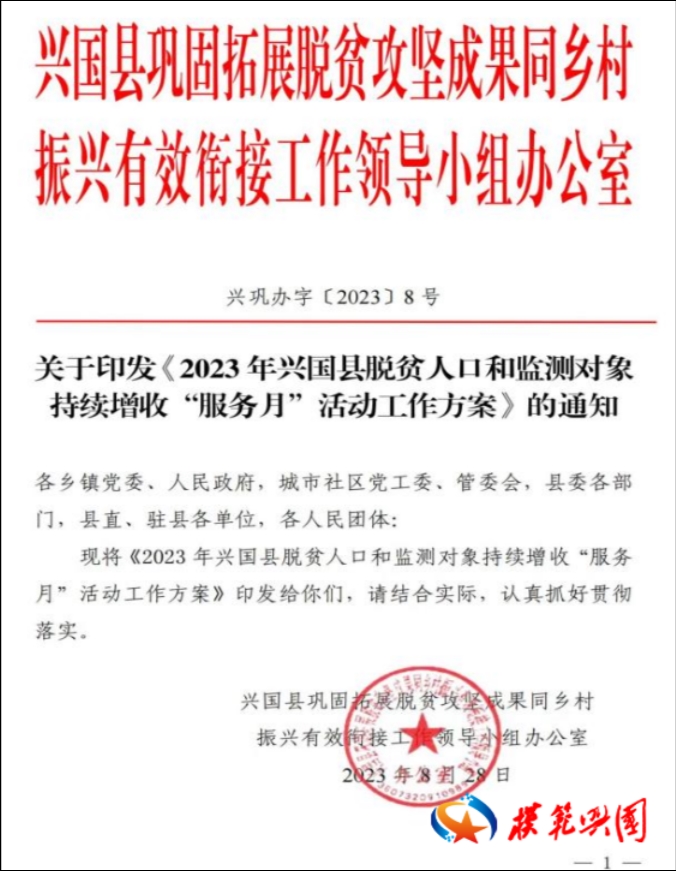 ▲8月28日制定印發(fā)《2023年興國縣脫貧人口和監(jiān)測對象持續(xù)增收“服務(wù)月”活動工作方案》