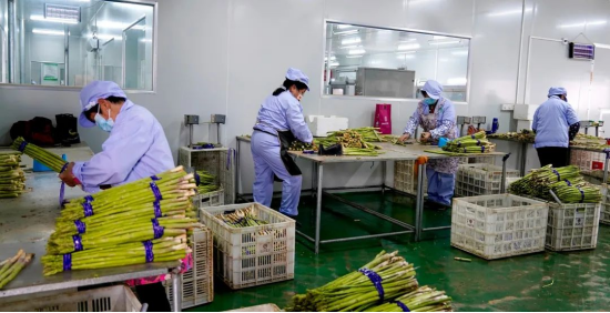 垓上村立足富硒土壤特色資源稟賦,建成千畝富硒蘆筍、千畝富硒大米等“雙千”富硒產業基地。這是當地村民在富硒蘆筍加工車間勞作。