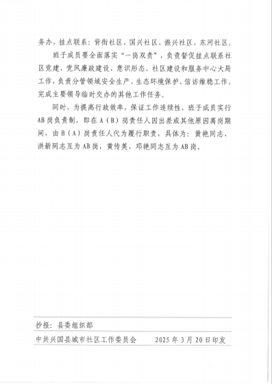 關(guān)于調(diào)整興國縣城市社區(qū)黨工委、管委會領(lǐng)導(dǎo)班子成員分工的通知