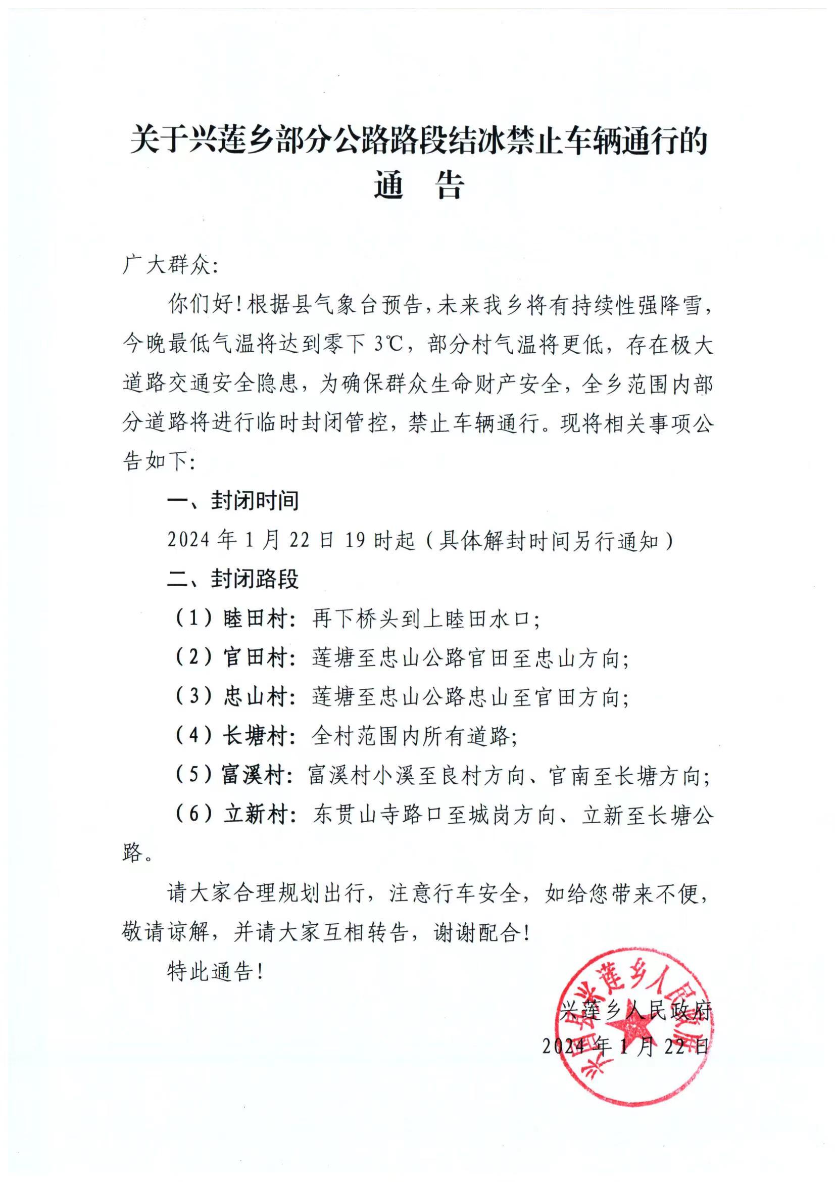 關于興蓮鄉(xiāng)部分公路路段結冰禁止車輛通行的通告