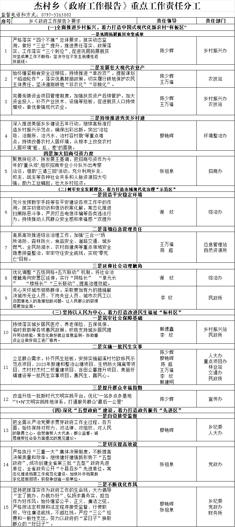 杰村鄉(xiāng)《政府工作報告》重點工作責任分工