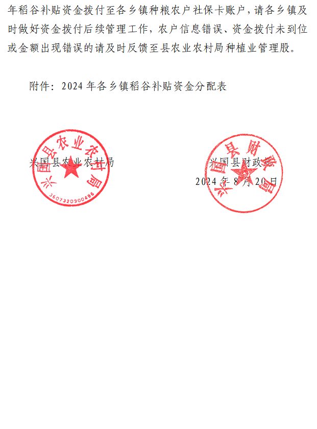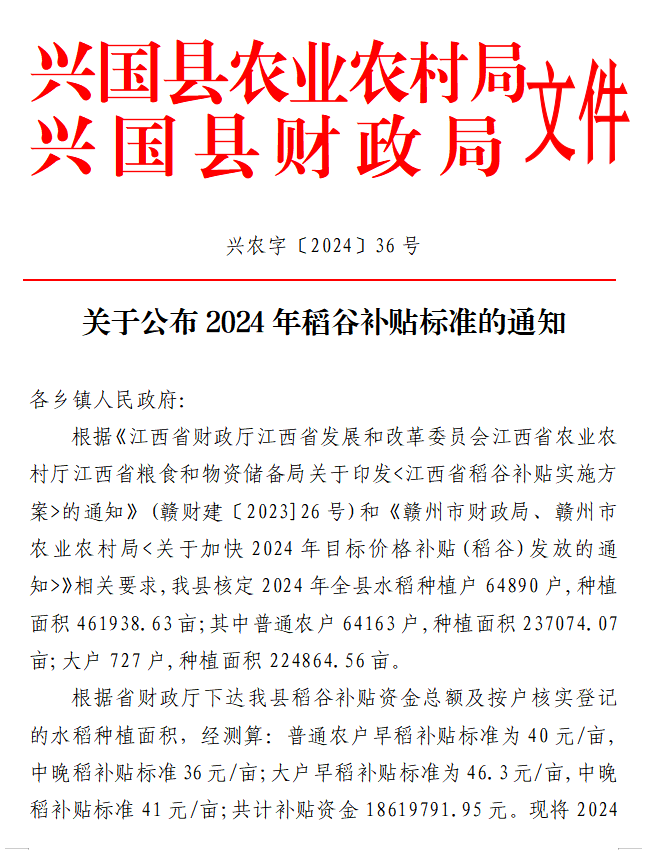 關于公布2024年稻谷補貼標準的通知
