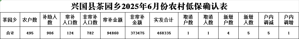 興國縣茶園鄉農村低保2025年6月份撥款明細表