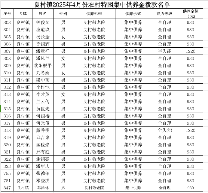 良村鎮(zhèn)2025年4月份農(nóng)村特困集中供養(yǎng)金撥款名單
