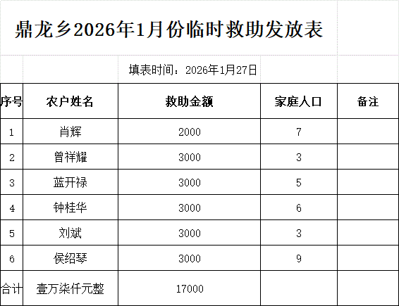 鼎龍鄉2026年1月臨時救助發放名單