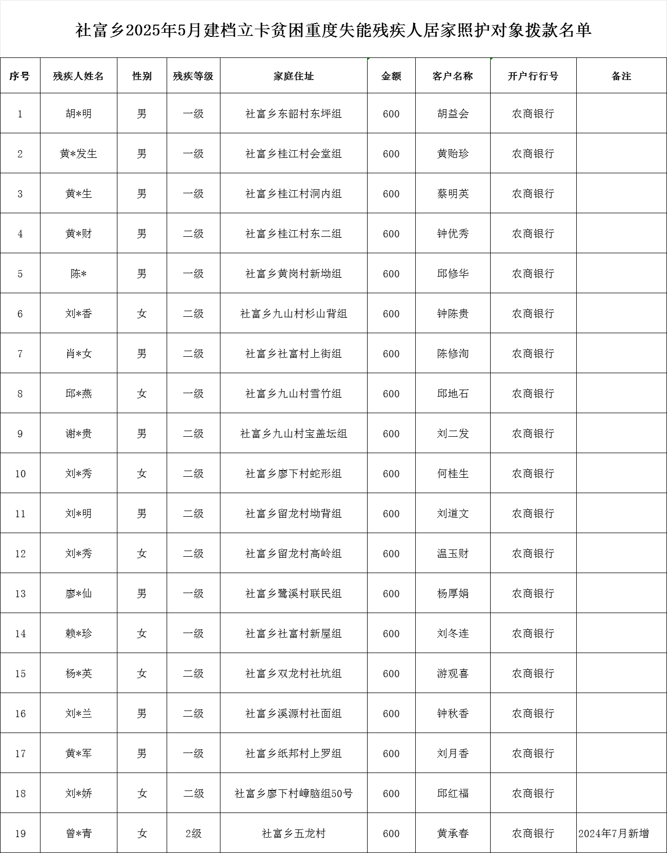 社富鄉2025年5月建檔立卡貧困重度失能殘疾人居家照護對象撥款名單