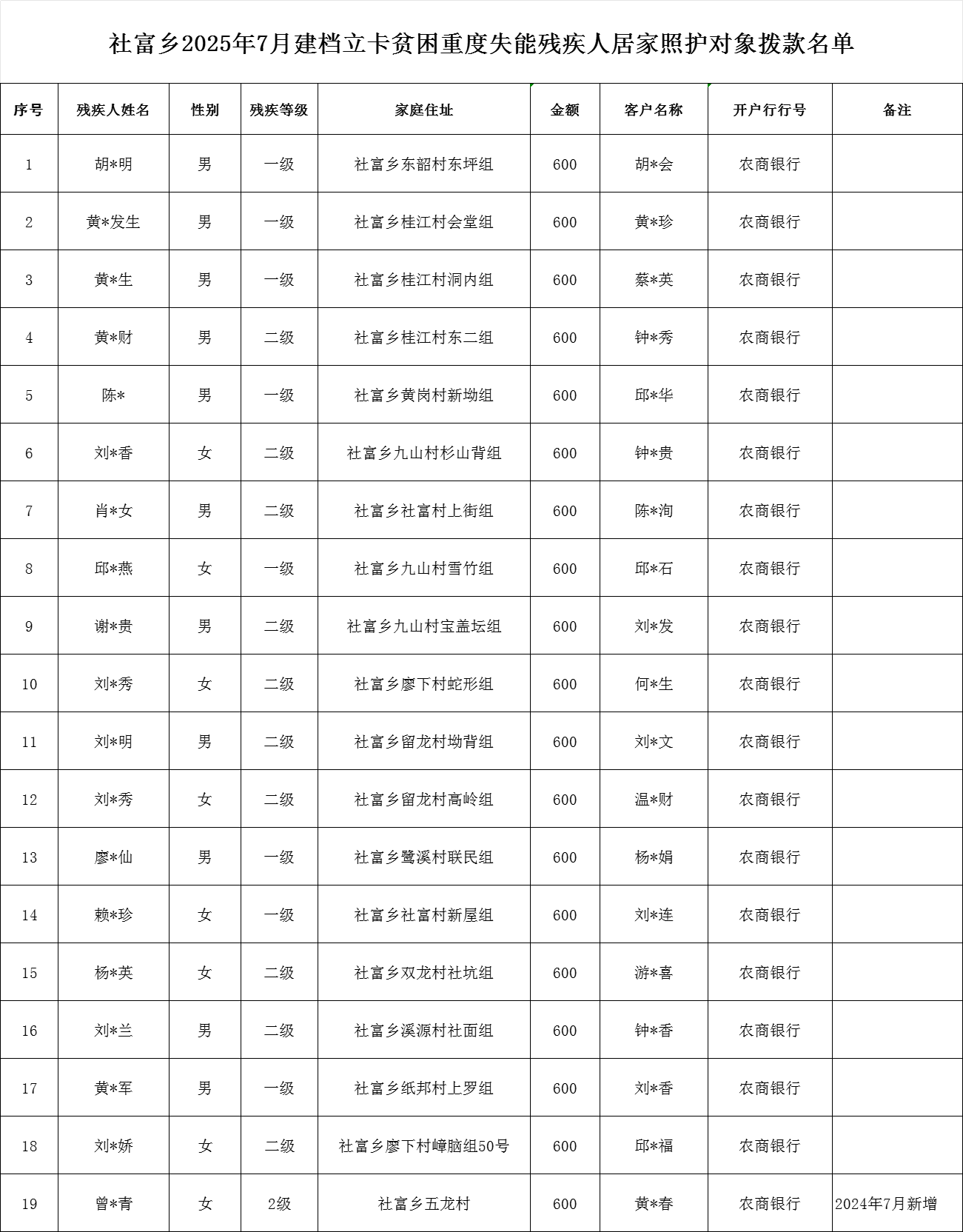 社富鄉2025年7月建檔立卡貧困重度失能殘疾人居家照護對象撥款名單