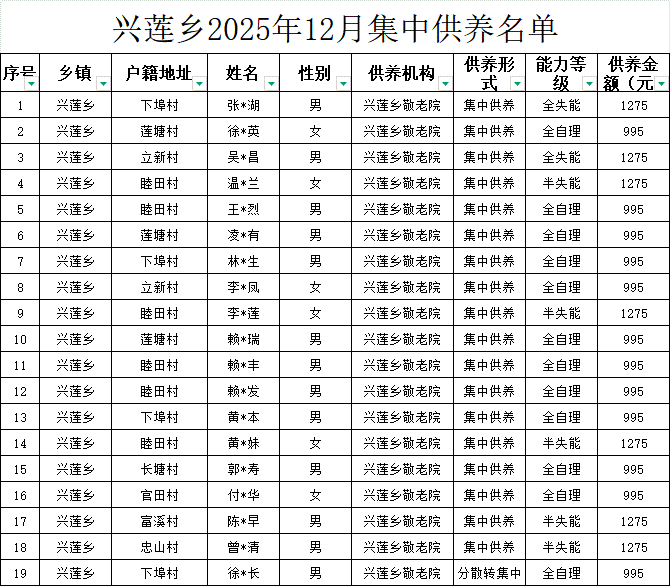 【社會救助】興蓮鄉2025年12月集中供養名單