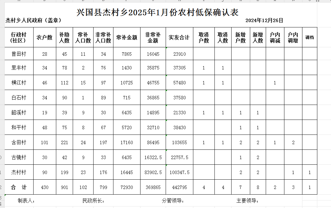 杰村鄉2025年1月農村低保確認匯總表