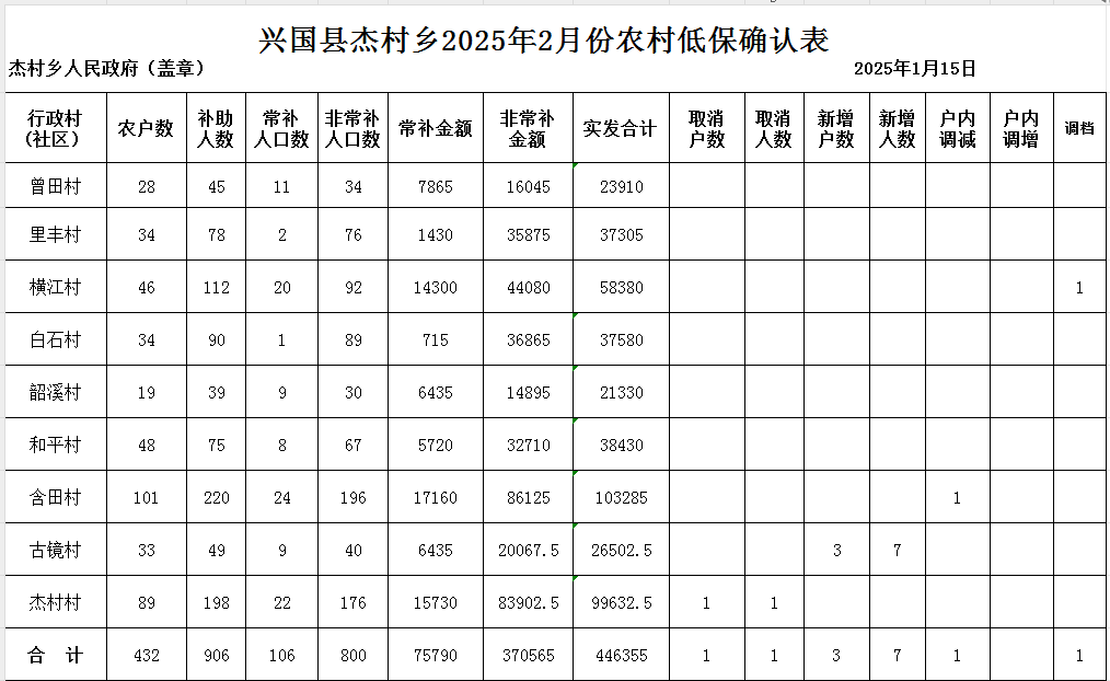 杰村鄉2025年2月農村低保確認匯總表