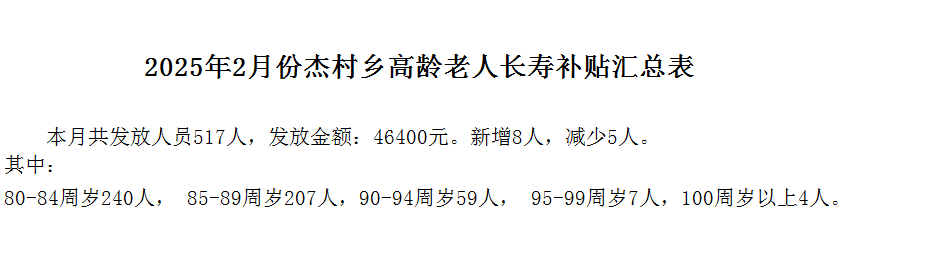 2025年2月份高齡老人長壽補貼匯總表