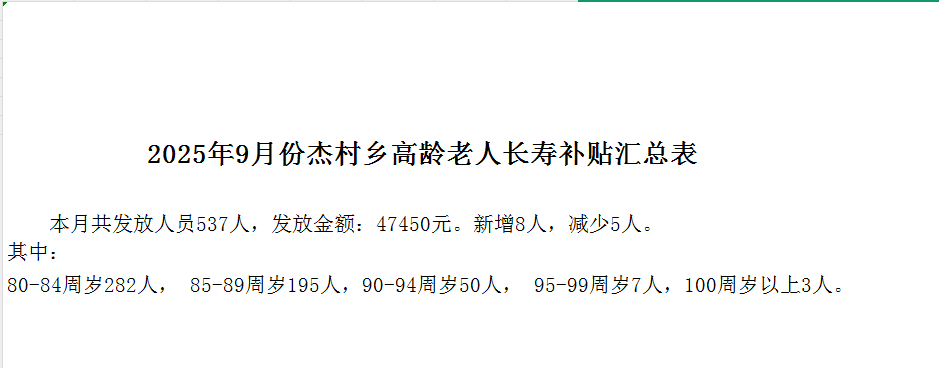 2025年9月份杰村鄉高齡老人長壽補貼匯總表