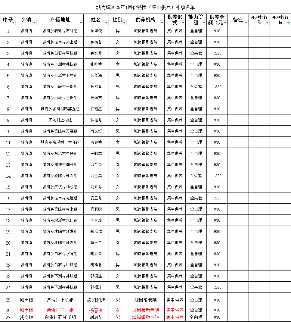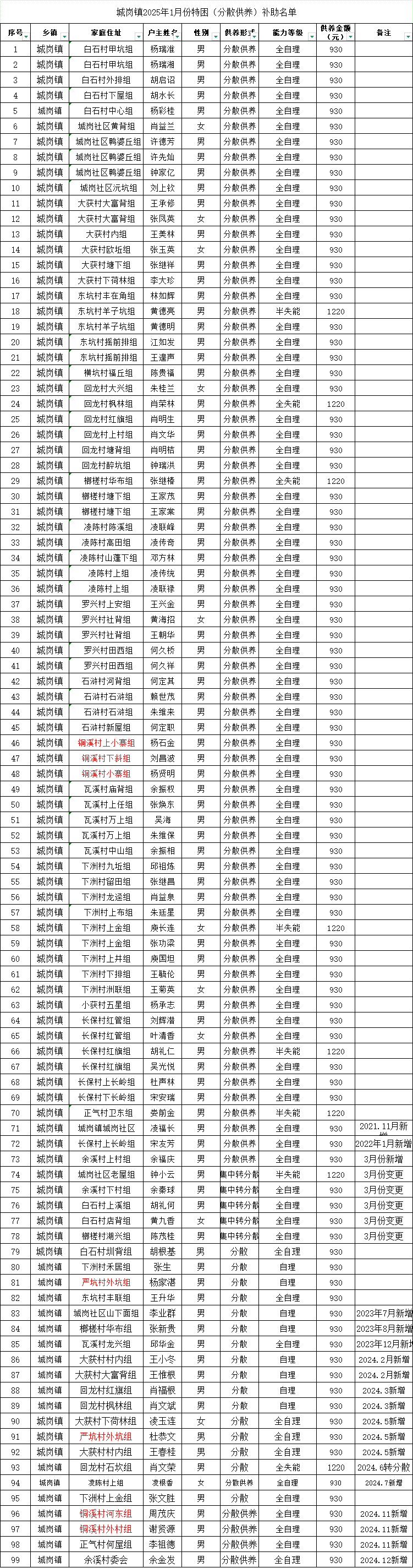 城崗鎮2025年1月份特困(分散供養、集中供養)補助名單