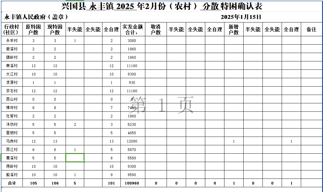興國縣永豐鎮(zhèn)2025年2月份(農(nóng)村)分散特困確認(rèn)表