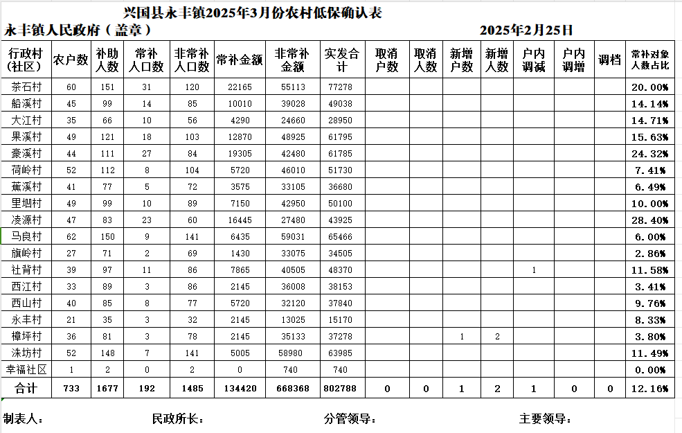 興國縣永豐鎮(zhèn)2025年3月份農(nóng)村低保確認(rèn)表