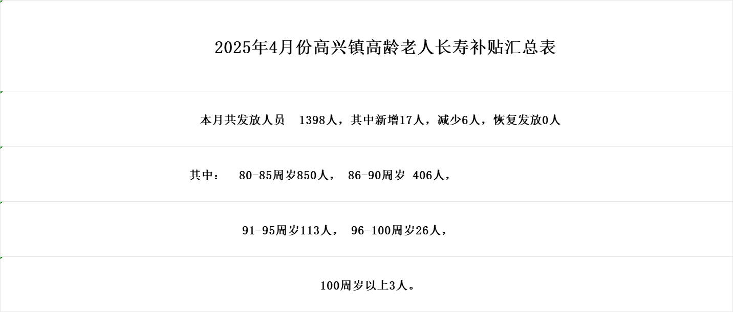 【高齡補貼】2025年4月份高興鎮高齡老人長壽補貼匯總表