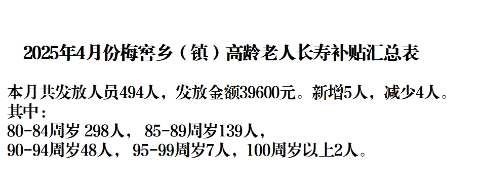 【養老服務】梅窖鎮2025年4月份高齡補貼匯總表