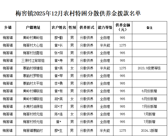 梅窖鎮2025年12月農村特困分散供養金撥款名單
