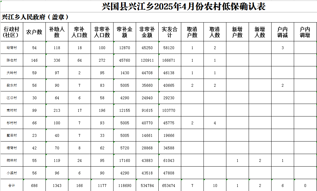 【社會救助】興江鄉2025年4月份農村低保公示