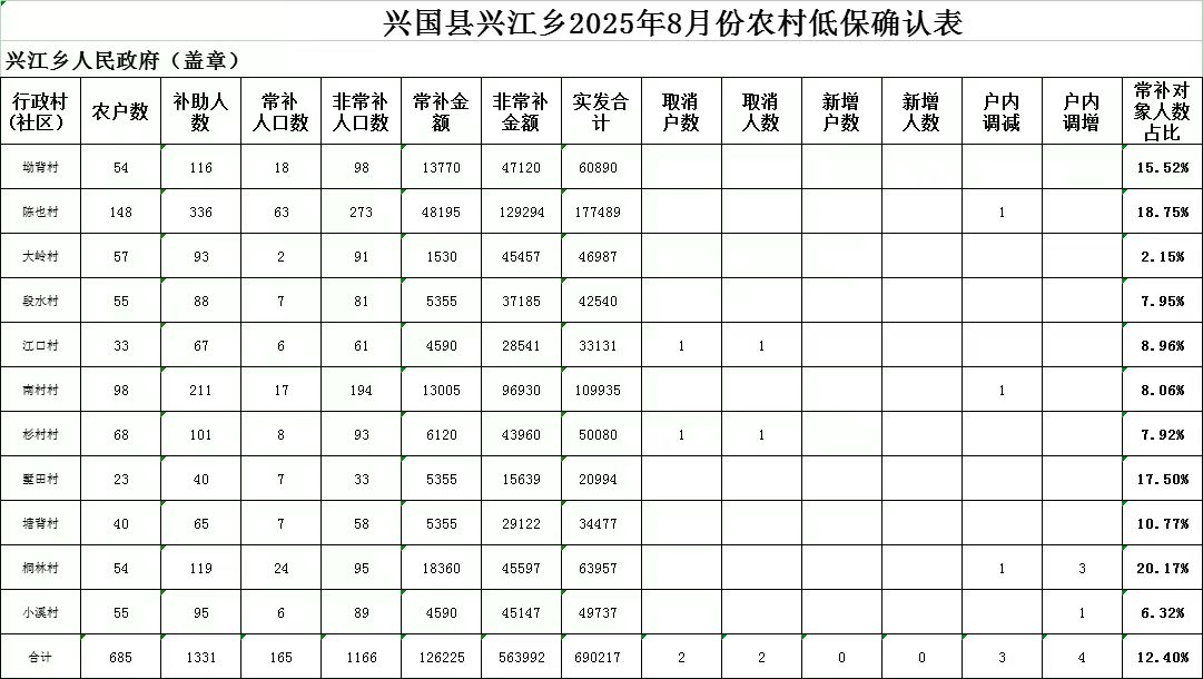 【社會(huì)救助】興江鄉(xiāng)2025年8月份農(nóng)村低保公示