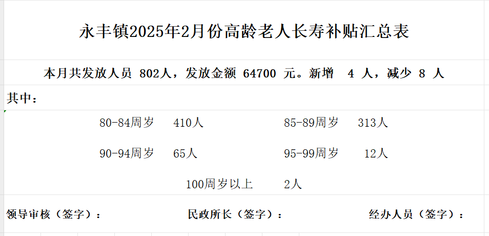 永豐鎮(zhèn)2025年2月份高齡老人長壽補貼匯總表