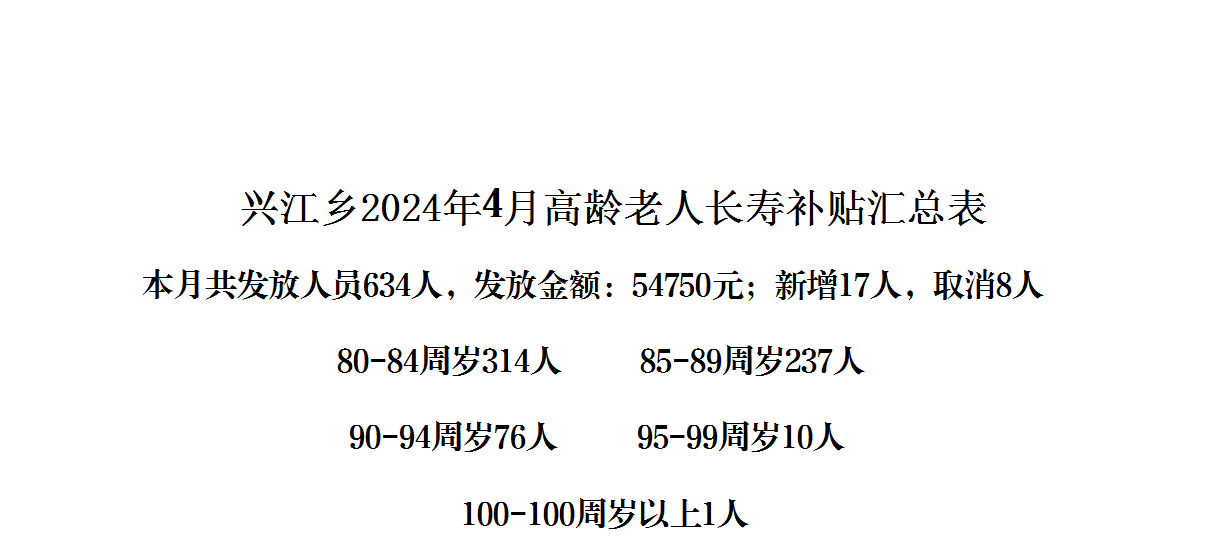 【養老服務】興江鄉2024年4月份高齡老人長壽補貼發放公示