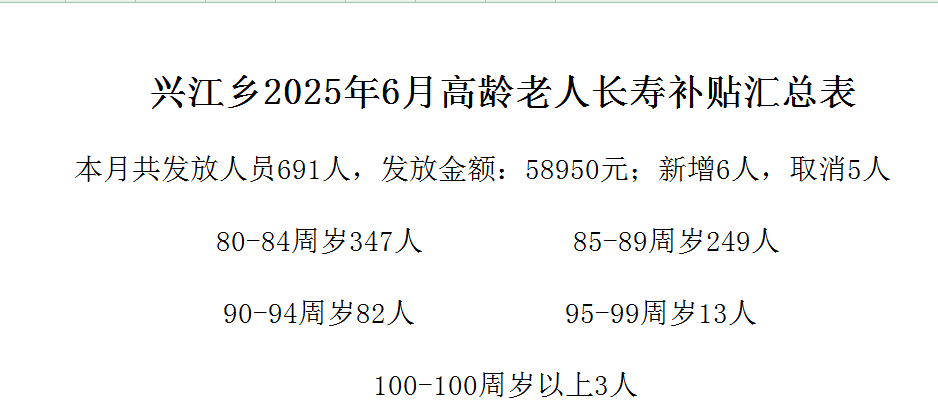 【養老服務】興江鄉2025年6月份高齡老人長壽補貼發放公示