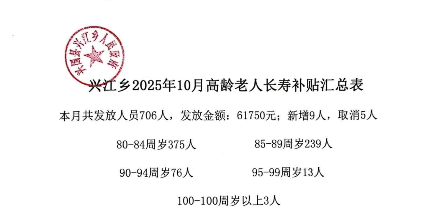 【養(yǎng)老服務(wù)】興江鄉(xiāng)2025年10月份高齡老人長壽補貼發(fā)放公示