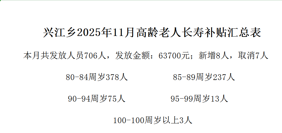 【養(yǎng)老服務(wù)】興江鄉(xiāng)2025年11月份高齡老人長壽補(bǔ)貼發(fā)放公示