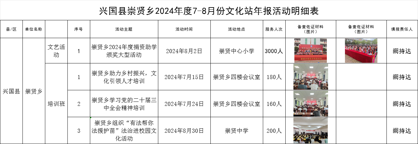 興國(guó)縣崇賢鄉(xiāng)2024年度7-8月份文化站年報(bào)活動(dòng)明細(xì)表