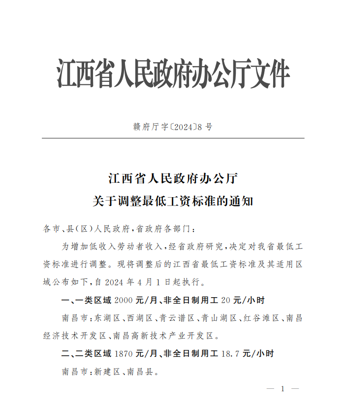江西省人民政府辦公廳關(guān)于調(diào)整最低工資標準的通知