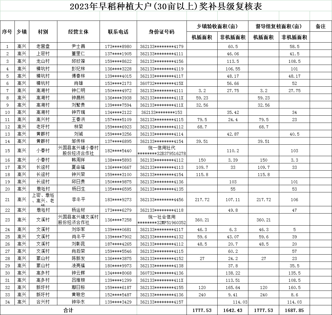【涉農補貼】高興鎮2023年早稻種植大戶(30畝以上)獎補縣級復核表