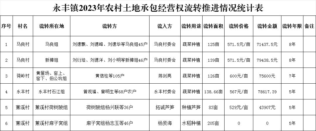 永豐鎮(zhèn)2023年農(nóng)村土地承包經(jīng)營(yíng)權(quán)流轉(zhuǎn)推進(jìn)情況統(tǒng)計(jì)表