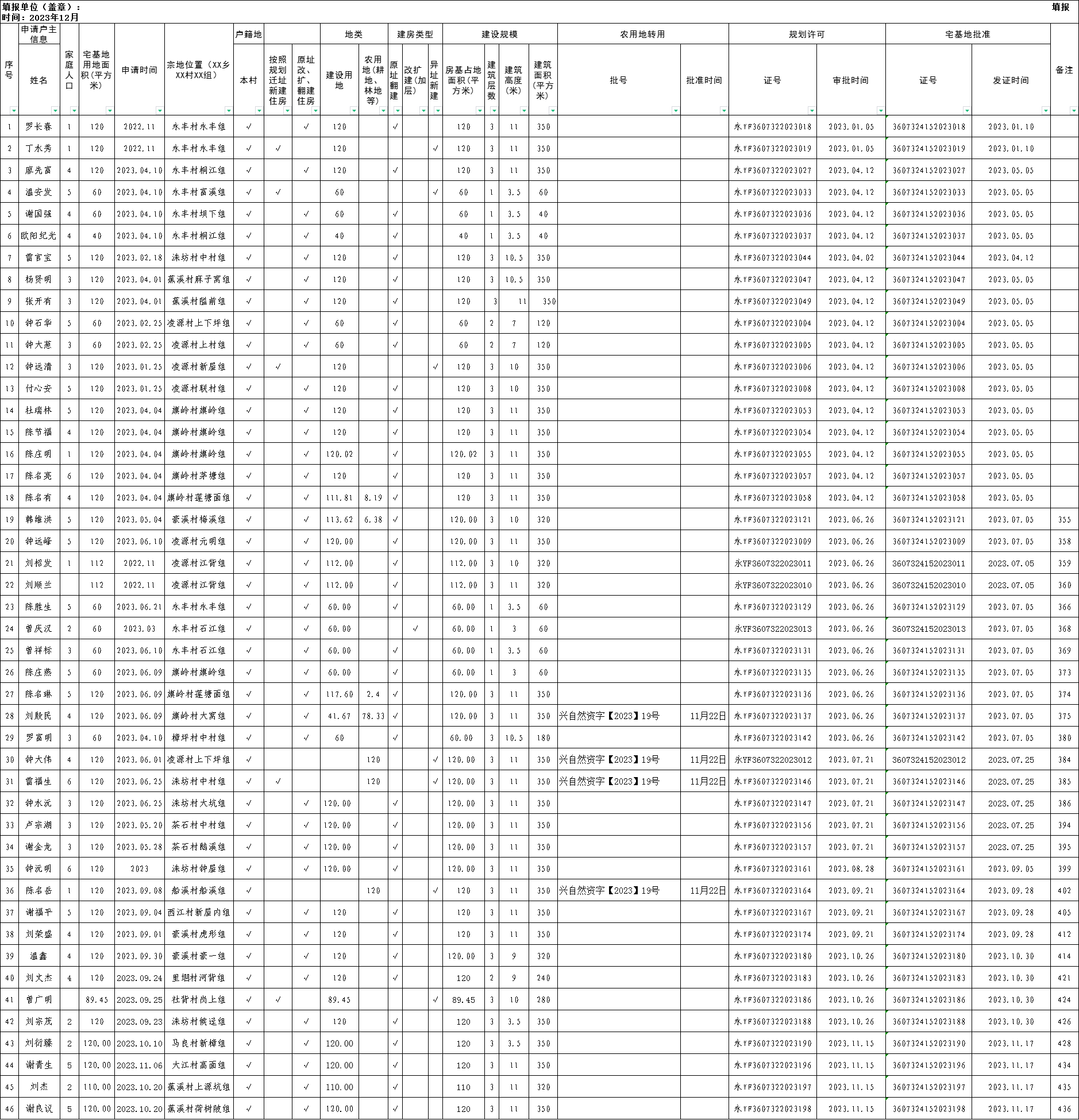 興國縣永豐鎮(zhèn)2023年農(nóng)村宅基地審批明細(xì)表