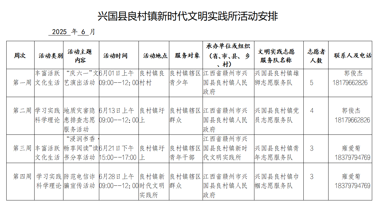 2025年6月份良村鎮(zhèn)新時(shí)代文明實(shí)踐所活動(dòng)公示