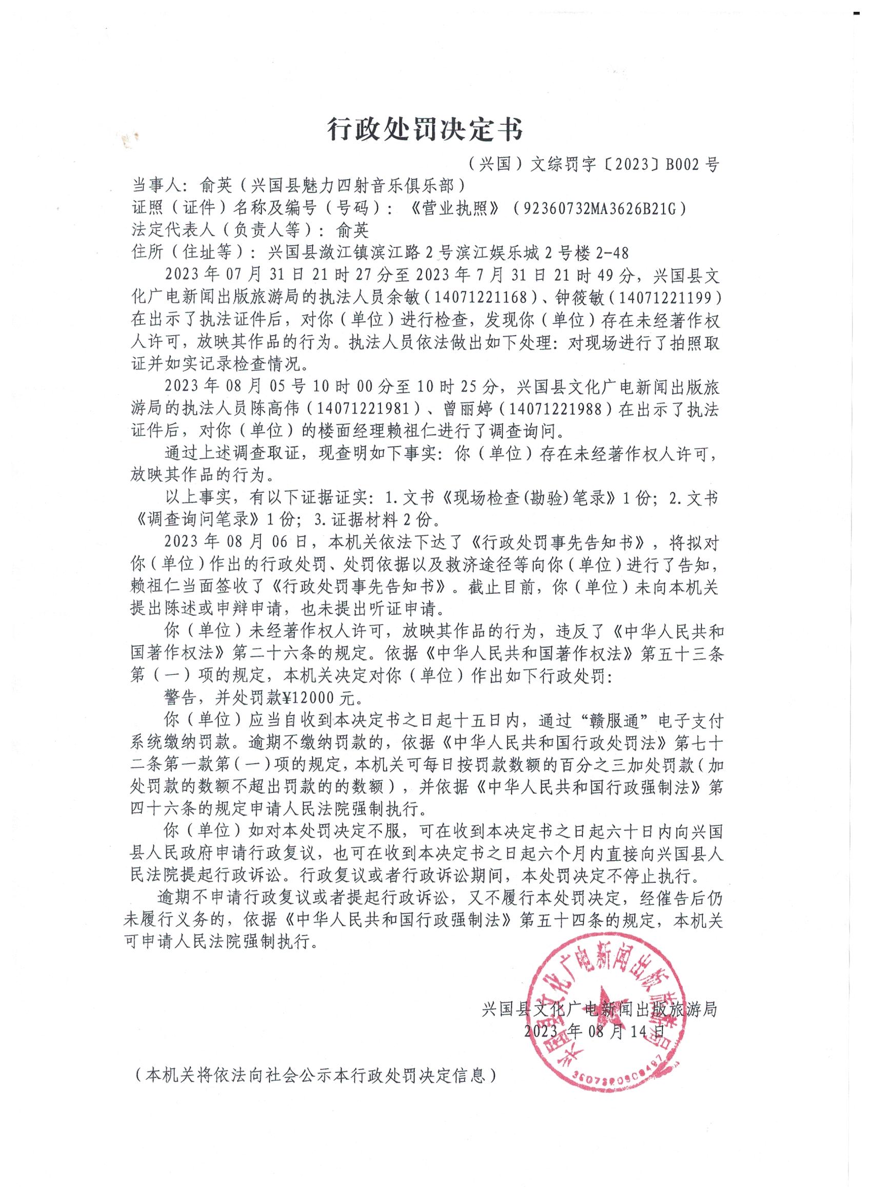行政處罰決定書(興國)文綜罰字〔2023〕B002號