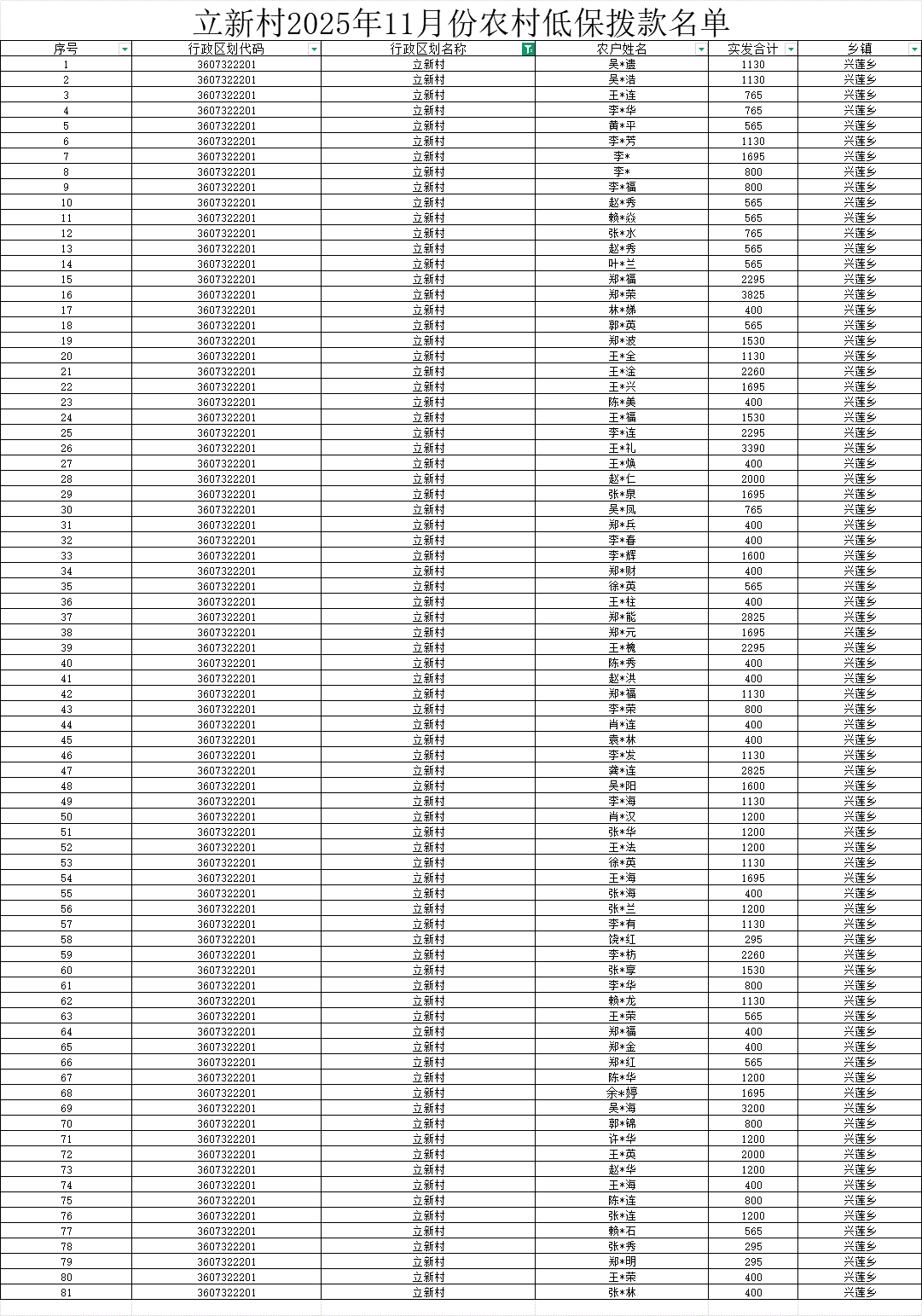 【社會救助】立新村2025年11月份農村公示