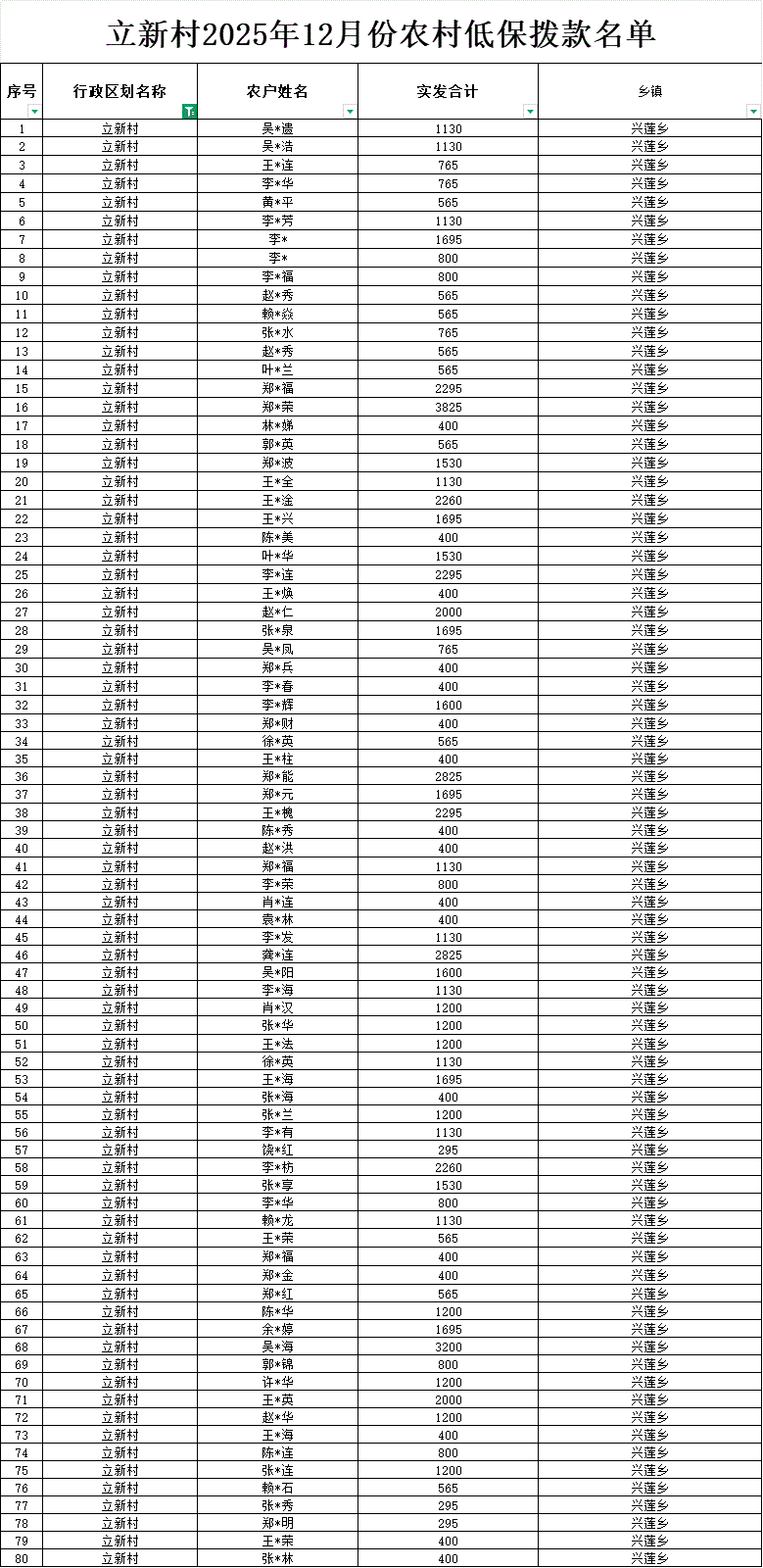 【社會(huì)救助】立新村2025年12月份農(nóng)村低保撥款名單公示