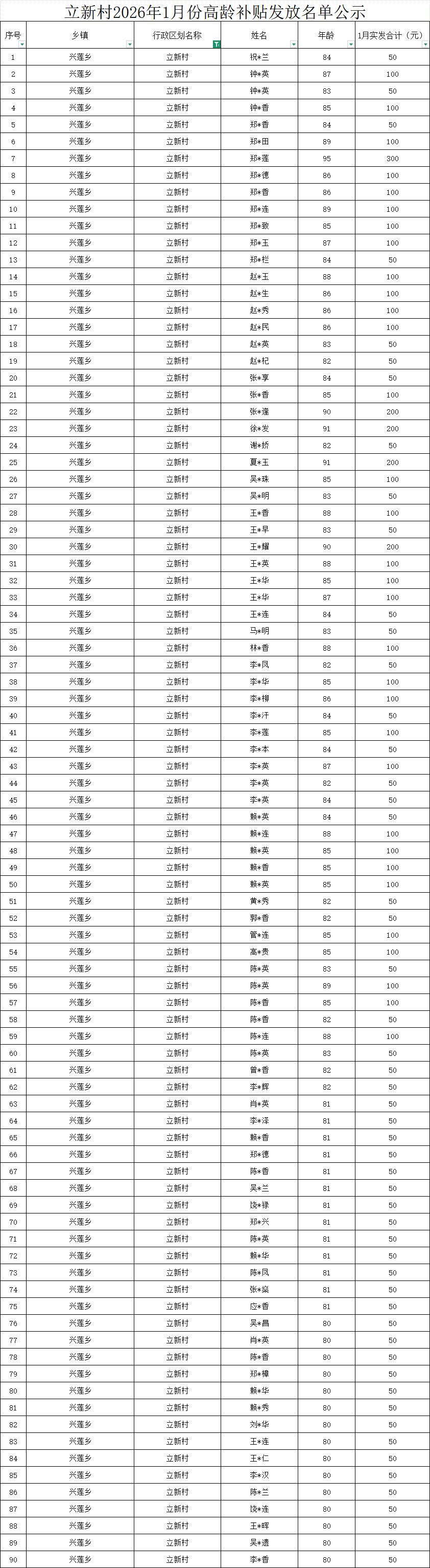 【養老服務】立新村2026年1月份高齡補貼發放名單