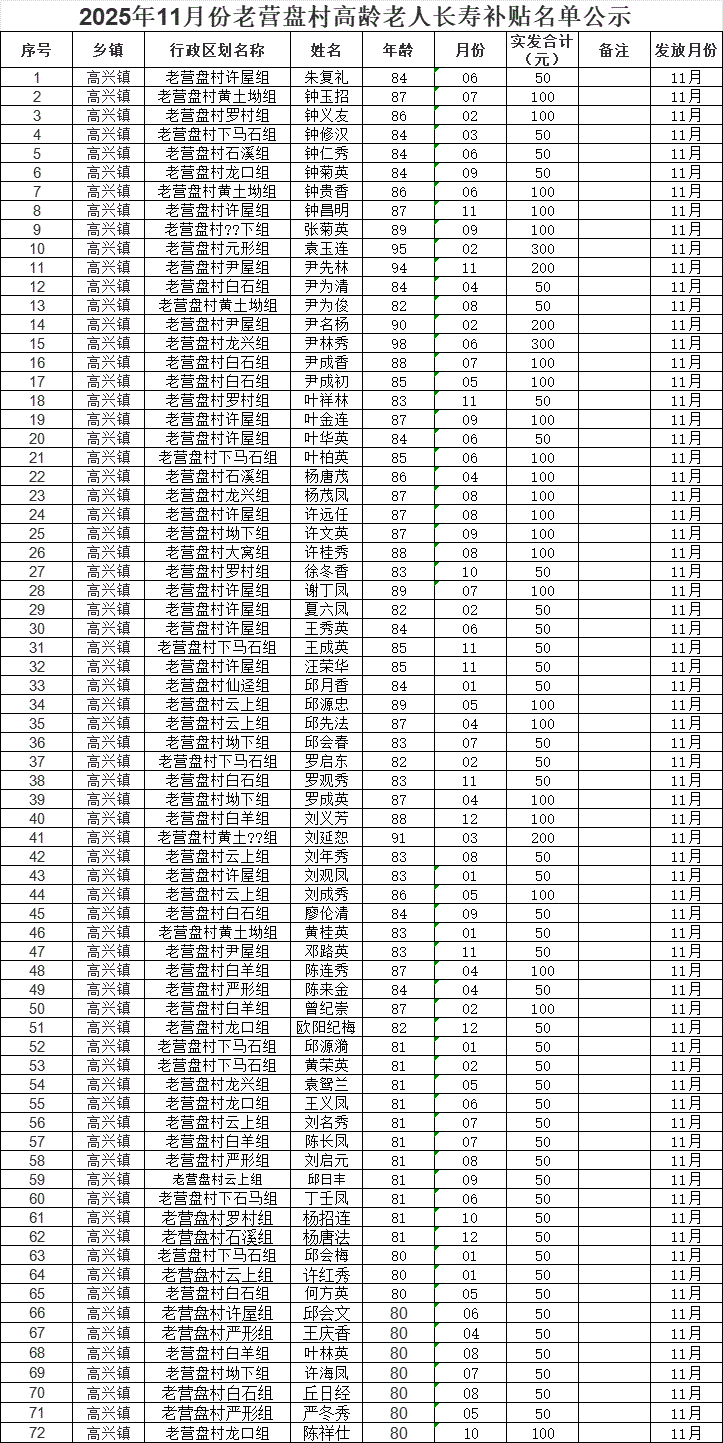 2025年11月份老營盤村高齡老人長壽補貼名單公示?