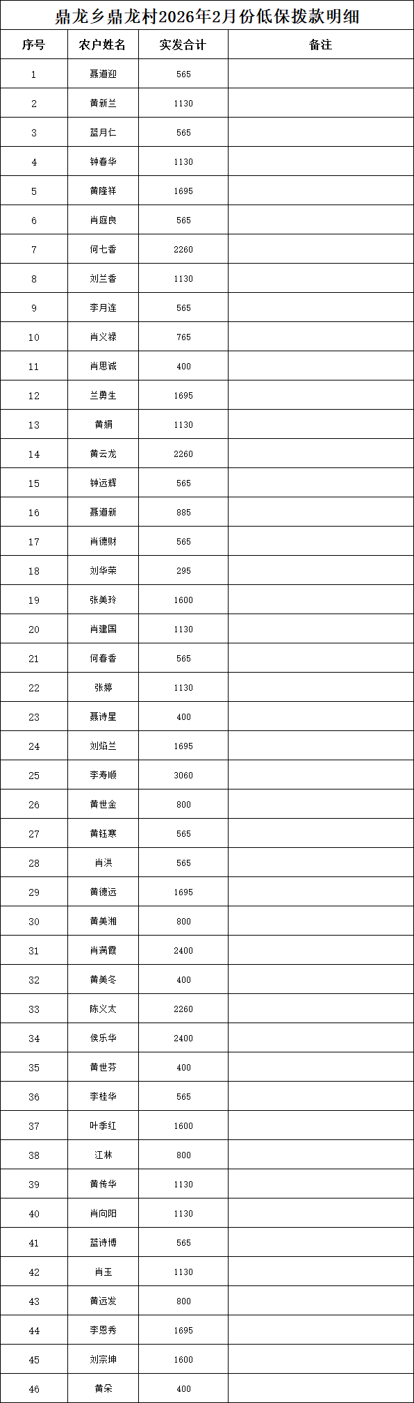 鼎龍鄉2026年2月低保名單公示