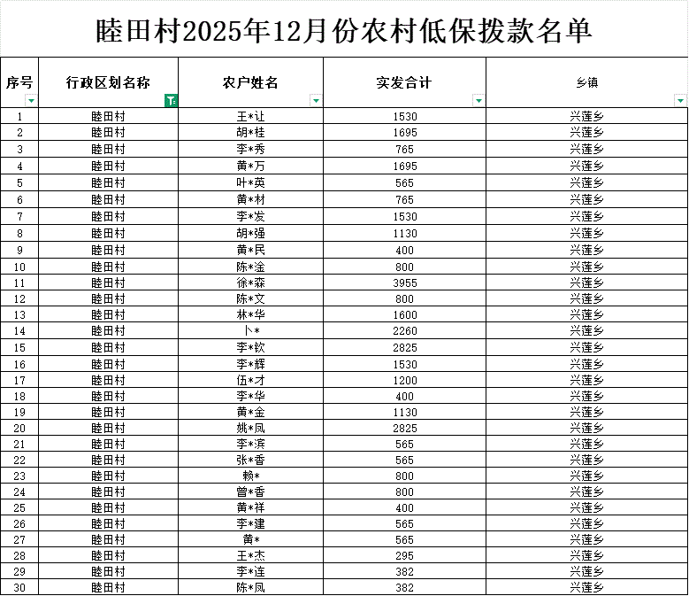 【社會救助】睦田村2025年12月份農村低保撥款名單公示