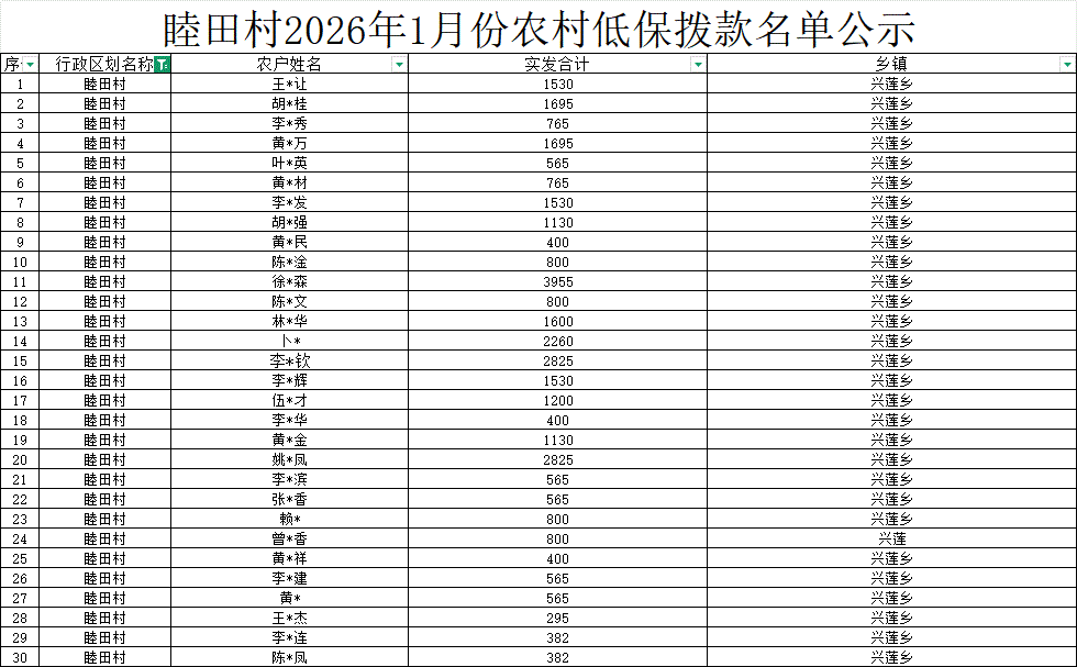 【社會救助】睦田村2026年1月份農村低保撥款名單公示
